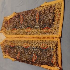 Intricate embroidered vest with a vintage style. Features a mix of colors including gold, blue, and red. Perfect for adding a unique touch to any outfit. size medium