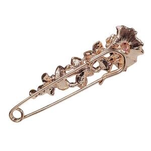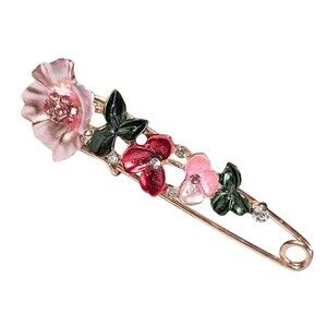 Add a touch of charm to your outfit with this beautiful vintage-inspired floral brooch. The design features a safety-pin style base with pink and red enamel flowers, accented by sparkling rhinestones and glossy green enamel leaves. Perfect as a statement piece for jackets, scarves, handbags, or hats.