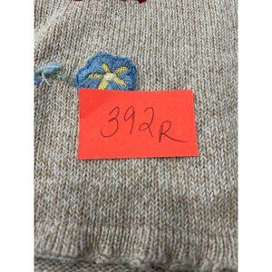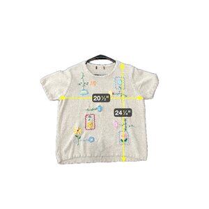 vintage knit top, embroidered floral top, short sleeve knit top, beige floral blouse, retro style top, summer knitwear, casual chic top, multicolor embroidery shirt, cotton blend top, lightweight knit blouse, medium size top, women's vintage top, flo