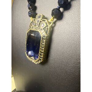 This statement necklace and ring set exudes an air of regal elegance, featuring a gold-tone setting and vibrant blue crystals. Faceted beads enhance the necklace's luxurious appeal, while the intricate detailing on the matching ring adds sophistication. Ideal for those who appreciate vintage-inspired designs and bold accessories that captivate attention.