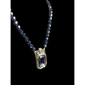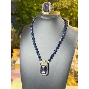 Vintage Style Gold & Blue-Blacl Crystal Necklace & Ring Set With Faceted Beads -