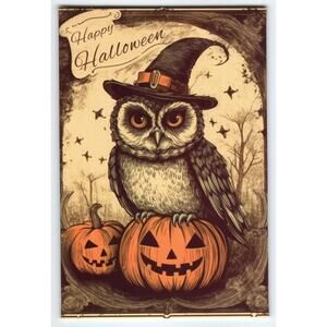 Vintage Style Halloween Owl on Jack-O'-Lanterns Photochrome Postcard