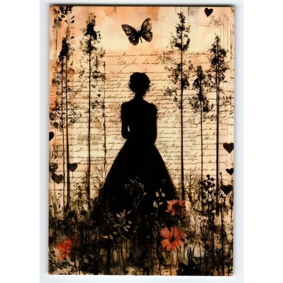 This unique vintage-style Halloween postcard features a striking silhouette of a woman in a flowing dress surrounded by tall, slender trees and delicate floral details. A prominent butterfly hovers above, adding a whimsical touch to the eerie yet elegant scene. The background showcases a faded script overlay with scattered heart motifs, creating an artistic and nostalgic atmosphere.
