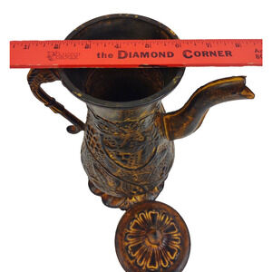 This 13" vintage style decorative pitcher jug is a unique addition to any collection or home decor. The dragon design adds an elegant touch to the rusty brown metal, making it a perfect piece for display in the kitchen, garden or atrium. The pitcher is made in China and has not been modified or handmade. Its original/reproduction status is vintage reproduction. The material is metal and the style is Renaissance.