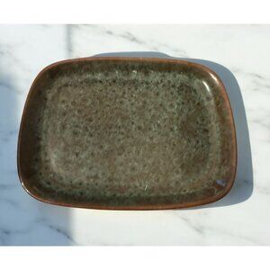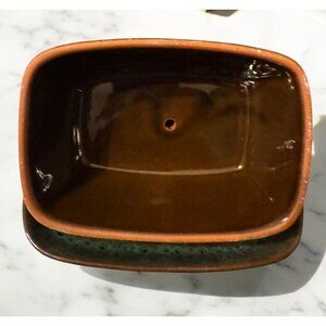 A ceramic butter dish featuring a rich brown and green glaze, offering functional storage with an aesthetic appeal for kitchen use.