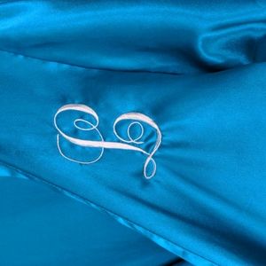 Adorable Blue/Teal short robe with "L" initial on front. Small ties on the inside. No belt.