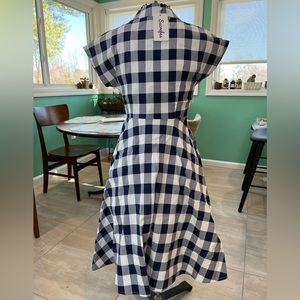 Amazing details on this, particularly the pockets. Biiig patch pockets with a pointed fold detail. You can carry your iPhone and all your friends’. This piece reminds me of dresses I’ve gotten from Hell Bunny, Stop Staring, and Voodoo Vixen. It’s stretchy, too, so it forms to your figure. Some white fuzzy thread spots on collar and a fray under the button as shown in picture. It is just frayed, it is not separated and I would style it with a belt as shown in the last 2 pics (not included). Great retro style Waist - 14.5” flat unstretched Length - 40”