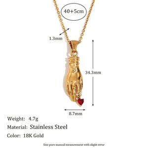 This vintage style necklace features an 18K gold-plated hand pendant with a striking red heart rhinestone, perfect for adding a touch of elegance to any outfit.