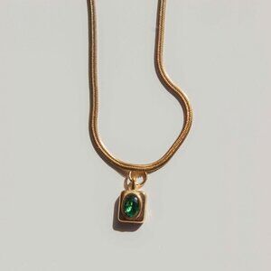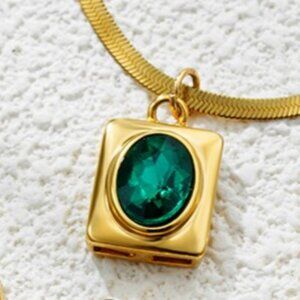 This Vintage Style Necklace with a Square Pendant is crafted with Stainless Steel and 18k Gold Plating, exuding a classic charm. The rectangle-shaped pendant features a green main stone in an oval shape, set in a stylish snake chain with a lobster closure. The adjustable necklace has a length of 15 inches, making it a versatile accessory for any outfit or occasion. This piece of fashion jewelry is a timeless addition to any jewelry collection.