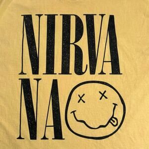 • Design: Yellow tee with bold black “NIRVANA” text and iconic smiley face logo