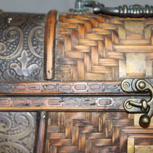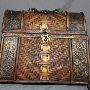 This vintage style Oriental storage box is a unique addition to any home, with its wood and metal construction, woven wicker exterior, and embossed metal accents. The front latch adds a touch of security while the metallic finish gives it a touch of elegance. With dimensions of 11 inches in length, 9 inches in height, and 6.5 inches in width, this storage basket is the perfect size for organizing and storing various items in your living space. Its intricate design and vintage appeal make it a standout piece in any home.