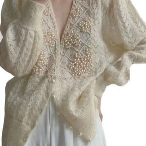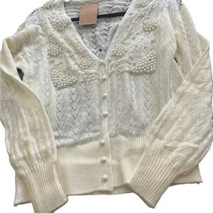 Vintage Style Pearl Encrusted Boho Cable Stitch Crème Cardigan Sweater New M