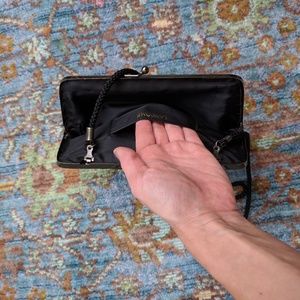 Black Silky Material with carefully stiched gold and Maroon Metallic shiny beading that form a unique overall wavy pattern. Double ball snap. Silky interior with pocket. Mint condition.