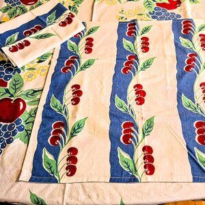 Vintage style reproduction by Crate and Barrel. Pre-owned, very good condition. Some unknow green spots on one edge (many be washed out or removed with stain remover) but I didn't want to try and remove them. Two matching table napkins. All 100% cotton. Interested, make an offer. From a smoke and pet hair free home. Fast shipping.