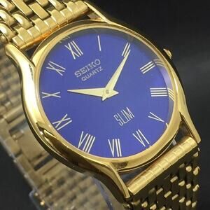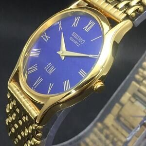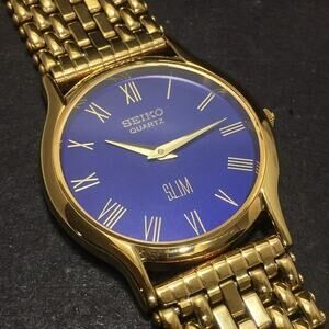 Vintage Style Seiko Quartz Mens Gold Watch & Blue accents W/ Metal Strap