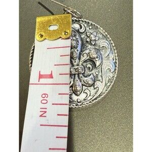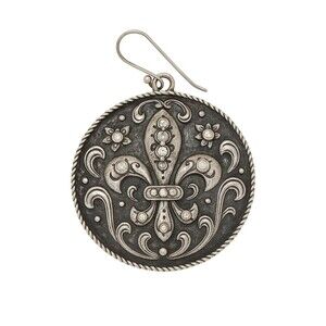 Elegant round dangle earrings featuring a raised Fleur-de-Lis and floral scroll design in silver tone metal. Detailed rope edging adds a touch of vintage western charm. Lightweight and versatile perfect for everyday wear or a statement boho look.