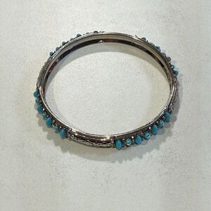 Keywords: bangle bracelet, silver tone, turquoise, cabochon, beaded edge, vintage style, bohemian, Southwestern, statement jewelry, hinged bangle, fashion bracelet, accessory, jewelry