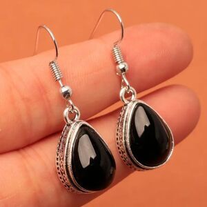 Vintage Style Silvertone Dangle Drop Earrings Black Onyx Crystal Stone Teardrop