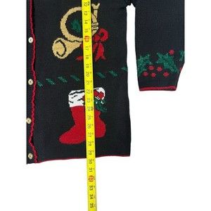 Vintage Style Studio Ugly Christmas Metallic Black Red Gold Cardigan Sweater 1X in nice preowned condition .