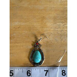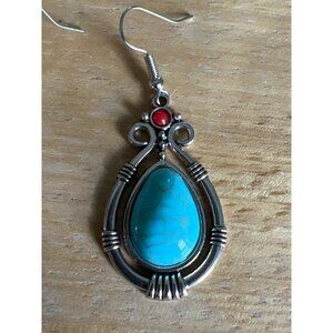 These exquisite earrings feature a stunning turquoise teardrop with a vibrant red gemstone accent, perfect for adding a touch of elegance to any ensemble. The vintage design and intricate detailing make them a captivating accessory choice.