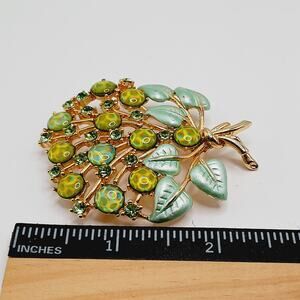 Vintage Style Watermelon Rhinestone Cabochon Tree Brooch Green Enamel Leaves