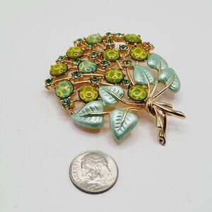 This unique brooch features sparkling iridescent cabochons that flash watermelon shades of green, gold, and orange, accented by faceted green rhinestones. The tree-shaped design is finished with delicate light green enamel leaves and a gold-tone setting, creating a bold yet elegant statement piece.