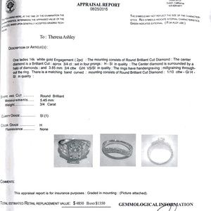 @karyn814 the appraisal report is the second photo. Center stone is 3/4. Side stones are half each. Plus the band has micro diamonds all through