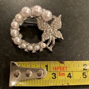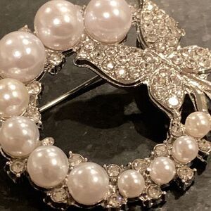 TAGS: butterfly brooch, faux pearl circle pin, rhinestone lapel pin, vintage-inspired brooch, silver-tone accessory, sparkling butterfly pin, retro pearl pin, elegant lapel accessory, whimsical insect brooch, chic bridal brooch, unique a wedding gift, timeless statement pin, collectible rhinestone brooch
