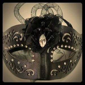 Jet Black Leather Mask With Bedazzled Gems On The Sides And Top.