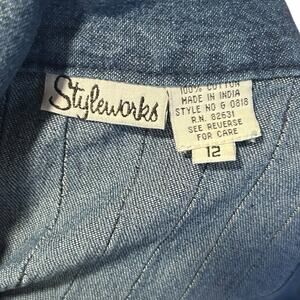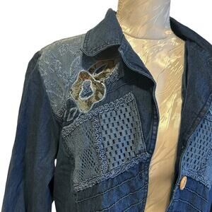 This vintage Styleworks denim duster features floral embroidery, lace accents, and a button front. Long sleeves and a flattering silhouette make it perfect for boho western styling or romantic cottagecore layering.