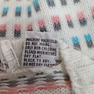Features feminine pastel pink and blue square geometric print on white tight knit acrylic, crew neck sweater vest, vintage 80s, ribbed bottom hem, sleeveless sweater, preppy style, perfect for layering.