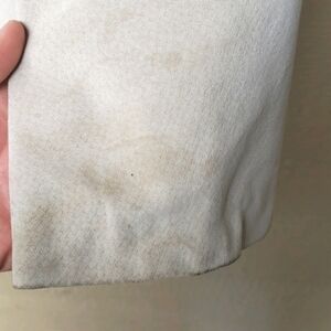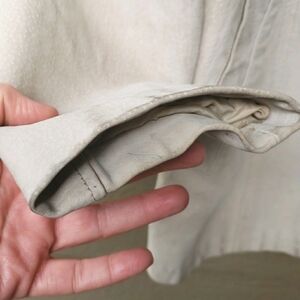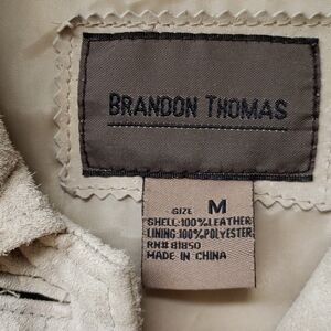 This is a really nice leather suede jacket. The lining is polyester. It is a Brandon Thomas design, Size Medium. Has a side pocket on each side. Buttons compliment the jacket. Could use a good dry cleaning. Some dirt along the cuffs. Some very light dirt spots throughout, that again, should come out with a dry cleaning. I believe this to be 80s/90s vintage based on research and style