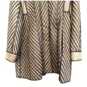 Extraordinary vintage shearling coat featuring alternating stripes of suede and printed bovine leather with a subtle snakeskin embossing. The organic shearling lining offers deep warmth and texture, while the precision of the chevron patterning highlights the garment’s rare craftsmanship. Each strip of leather is individually overstitched — a level of meticulous, intensive work rarely seen in modern production. A sculptural, statement piece for collectors of timeless, avant-garde outerwear.
