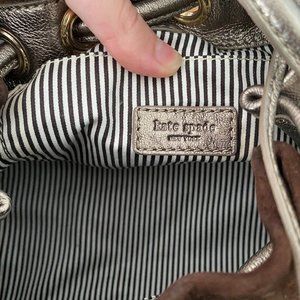 Pre-loved Vintage Suede Kate Spade Handbag coupled with gold hardware with a striped interior and subtle polka dot detailing on exterior.