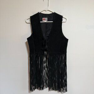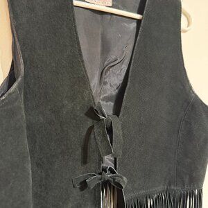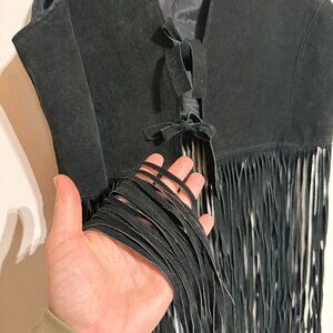 Fantastic vintage used condition. Two ties in the front. Smooth, clean, made in the USA. S&U Leather Fashions New York. Long, swishy fringe dances at the hem this fitted fringe vest crafted from black suede. It's cut with a V-shaped neckline and fastened by two ties at the front.