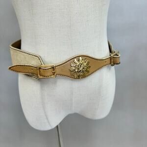 Vintage wide waist belt featuring a bold gold-tone lion medallion centerpiece.