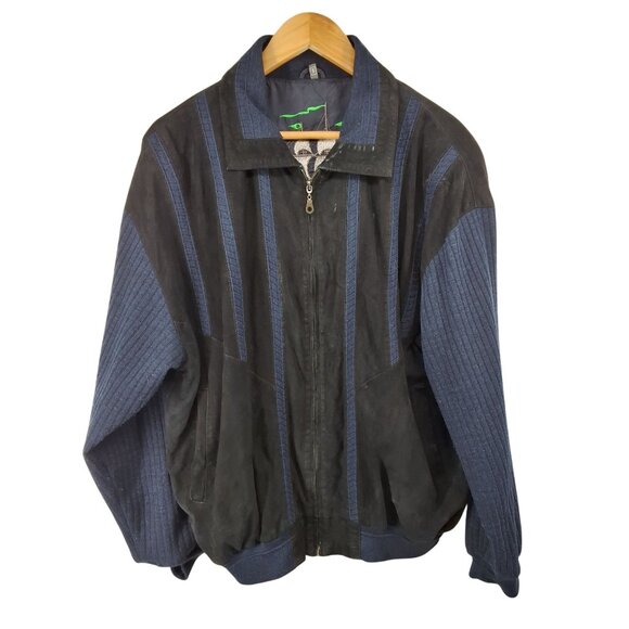 This vintage bomber jacket features a stylish design with a mix of textures, including ribbed sleeves and suede-like panels. Its unique embroidered interior adds a touch of character. Ideal for those who appreciate retro fashion in a compact size.