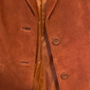 This one of a kind vintage jacket is made of carmel colored suede. It is rigid and holds a nice shape while on ones figure. The tie waste can be ties in front for a closed look, or tied in the back for a more open look to showcase a blouse/top. The suede is thick and quality, with no marks/spots. Fit is like a US women's size 6 (although listed as size 12). The jacket has no give so size accordingly.