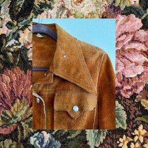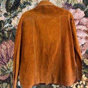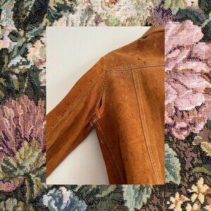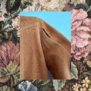 Camel Tone Suede Western Button Up Jacket. Has two rips on seams of shoulder, which can be fixed. Burn mark on the collar.