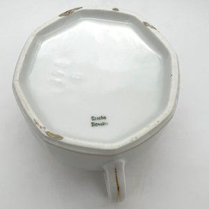 Vintage porcelain sugar bowl and creamer set from Czechoslovakia. The only markings on the bottom are the Czechoslovakia stamp and an embossed "175 G". The creamer measures approximately 5.75" tall and the sugar bowl is approximately 4" tall including the lid. The pattern contains blue diamonds and gold trim.