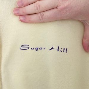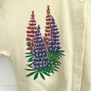 - Button front, double ribbing neck, ribbed cuffs, ribbed hem, Sugar Hill on front left, lupine flowers on front right
