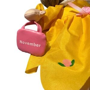 Charming doll in a bright yellow outfit. Features intricate lace details.