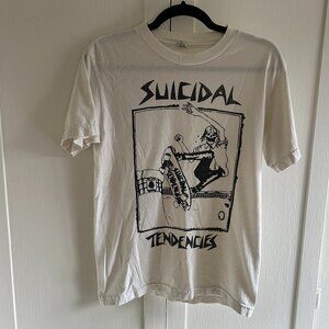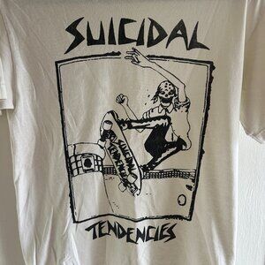 Rad vintage short-sleeve white t-shirt with black Suicidal Tendencies graphic on front. Purchased 10 years ago from the old surplus store on Sunset Blvd in Silverlake- apparently a kid who worked their in the 80s was making them and left a box in the back room! Size S. In used condition- no holes and only a very faint marking on the back (see last image).