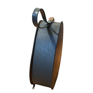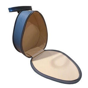 This adorable vintage travel case is an egg shape. It measures 12" tall, excluding the handle. It is about 10" wide at the widest part. It is a nice deep blue. ITt is in good vintage condition. Zipper works well. Inside is nice. Outside has some tiny white flakes on it that scrape off- I've gotten most off but there are still a few here and there. The bottom seam is a bit larger than the bag so it sticks out a bit, I don't think this is a flaw so much as how it was made- see photo- it is like this on both sides of the bag. It is at the bottom, so not noticeable. Otherwise, very nice, especially for its age.