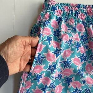 Vintage Summer Aqua Swim Trunks. Lue and pink sea print)starfish and sea turtles). Mesh liner. Back Velcro Pocket. Side seam hand pockets. Elastic waist with inner draw cord. Excellent condition. 5 1/2” inseam. Size XXL