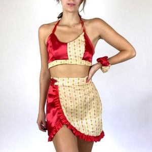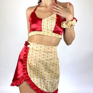 A bohemian patchwork summer set made of vintage fabric. A retro style top with ribbon ties. Top is lined with red satin fabric. A light yellow floral fabric with yellow ruffle. Hook and eye closures, can be easily moved to accommodate smaller/larger waist sizes. Matching scrunchie as well! One of a kind. The perfect summer set. Shown paired with a slip in first photo.