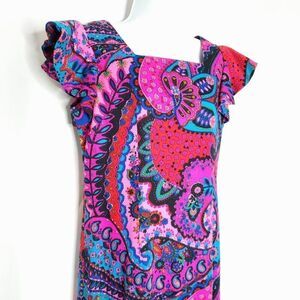 Vintage Sun Fashions Of Hawaii Psychedelic Floral Maxi Dress 12 Shift Flutter Sleeves Square Neck Pink17" Right Side Slit