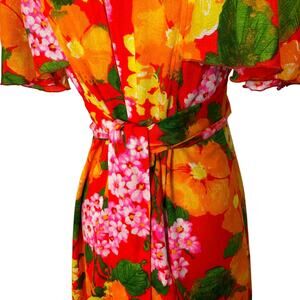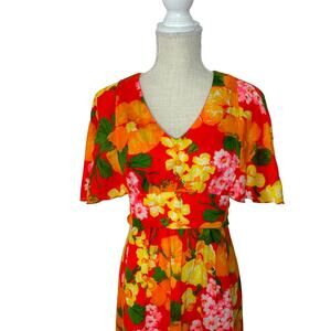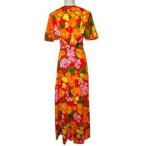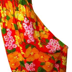Vintage Sun Fashions of Hawaii maxi dress. Dead stock with tag from The Wm. Hengerer Co. department store. 100% acrylic. Beautiful pink, orange, yellow floral pattern.