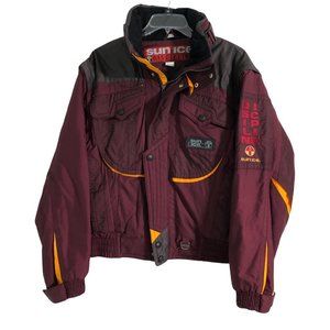Sun Ice Discipline. Labeled size 44 (Made in Canada) but size chart indicates should be US Large (see measurements in pics). This jacket has it all. Full snowboard jacket. Arms zip off to wear as just a vest. Optional hood rolled under collar. Puffer style with elastic gathered at waist. 2 chest flap pockets with velcro & snap. Zippered pocket under one of the chest pockets. 2 front zipped hand pockets. 1 large zipped pocket on back of jacket above waist. Interior velcro & mesh pocket. Both zipper and snap front closure. Adjustable neck so can create a tighter fit for cold days. Adjusted velcro arm cuffs. Black quilted interior lining. Coat is maroon (wine/burgundy) with orange accents. It is a fun, good looking and well made coat with lots of features. Good previously owned condition with no rips or stains. Retails for over $400.