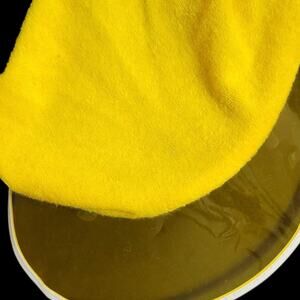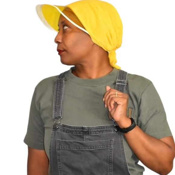 Vintage Saks Fifth Avenue Suzy sun hat FEATURES a bright yellow soft terry fabric with a bow accent at the nape of neck. Elasticized in back. Yellow tint visor brim.